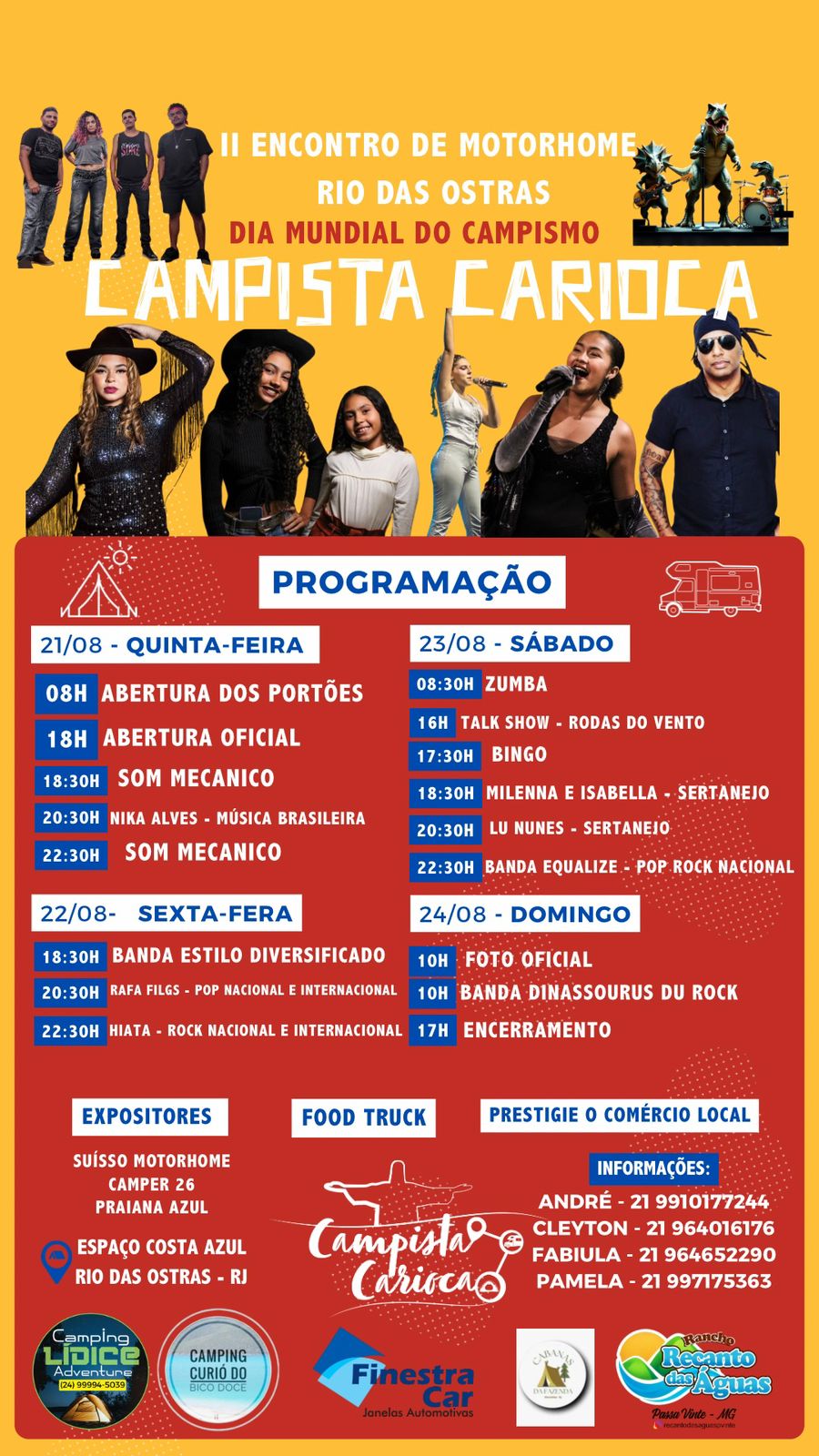Sertanejo, rock, pop e MPB são os ritmos que vão animar a segunda edição do Encontro de Motorhome, entre os dias 21 e 24 de agosto, na Área de Eventos de Costazul, em Rio das Ostras. Artistas locais vão comandar os shows, que têm entrada franca. O evento celebra o Dia Mundial do Campismo e é promovido pela Prefeitura e Fundação Rio das Ostras de Cultura.