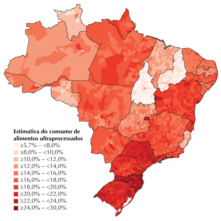 A participação considera a porcentagem de calorias provenientes de ultraprocessados em relação ao total de calorias consumidas por um indivíduo ou população, e a pesquisa revelou uma grande discrepância entre os Estados do Brasil. Essa diferença pode ser evidenciada comparando o município de Aroeira do Itaim, no Piauí, com 6% de participação dos ultraprocessados, e Florianópolis, Santa Catarina, com mais de 30%. Em geral, as médias mais altas foram observadas no Distrito Federal e nos Estados do Sul e Sudeste, exceto no Espírito Santo. Os Estados da região Norte e Nordeste, com exceção da Bahia, apresentaram as mais baixas.