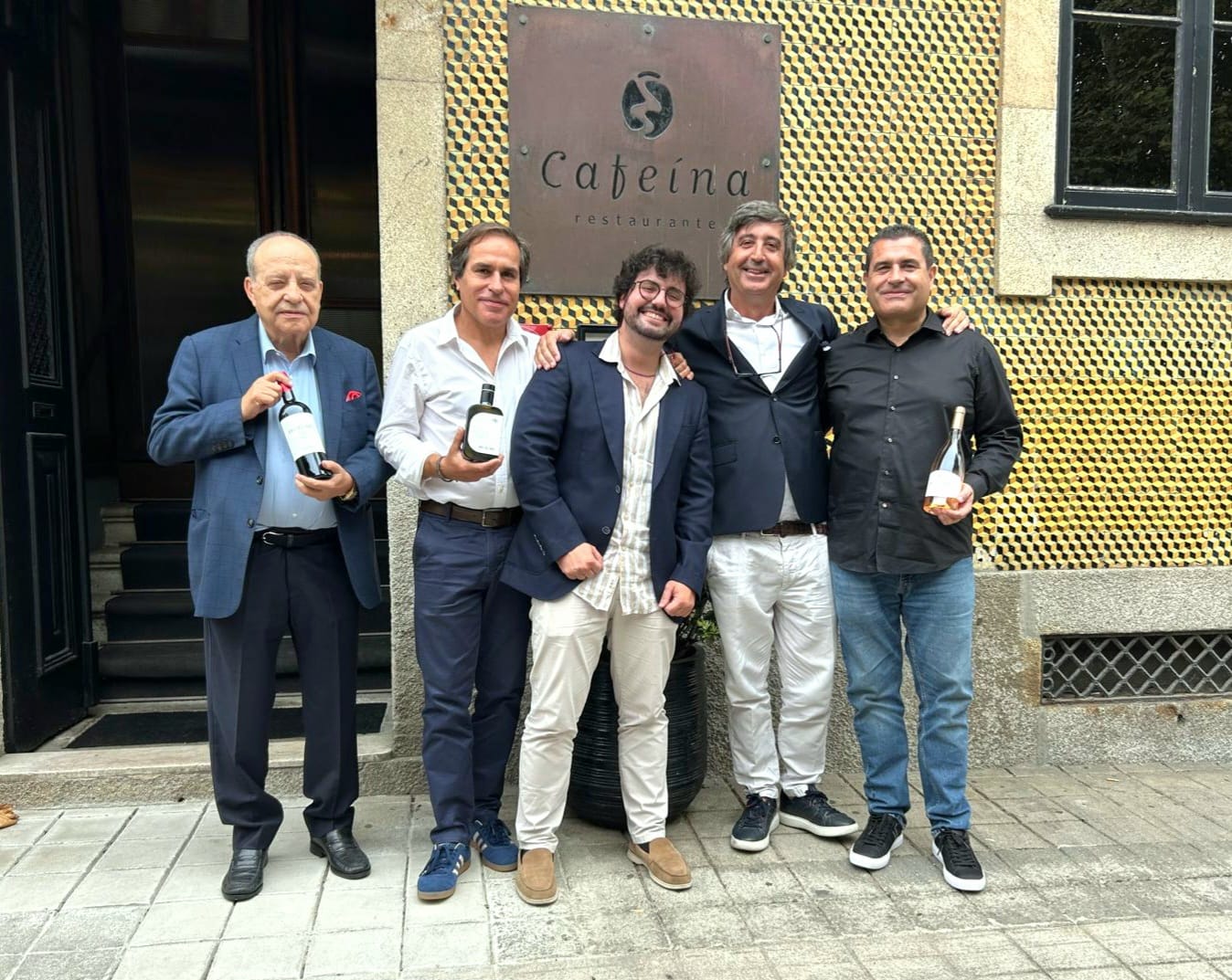 Da esquerda para direita: o patriarca e mentor Eugênio Branco (Quinta dos Muros), ladeado do filho Pedro Branco com Pedro Alves e Jorge Alves (enólogo do Projeto), seguidos do outro filho João Branco em frente ao restaurante Cafeína, do expoente empresário da Restauração Vasco Mourão.