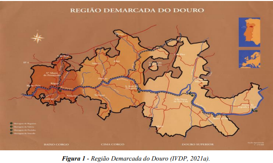 Portugal está na lista dos 10 maiores países produtores de vinho no mundo (OIV, 2021) contemplando 14 regiões vitivinícolas, divididas em 31 Denominações de Origem Protegida (DOP) (IVV, 2021a). Dentre estas encontra-se a Região Demarcada do Douro (RDD), a mais antiga região vitícola demarcada e regulamentada do mundo. Remonta a meados do Século XVIII, determinada pelo Marquês de Pombal no reinado de D. José I (1756) (Figueiredo, 2015). Desde então, foram criados regulamentos de controlo e certificação de qualidade do seu principal produto, o Vinho do Porto (Jones, 2013; Magalhães, 2015). A RDD está situada no nordeste de Portugal, ao longo do rio Douro, desde Barqueiros (na confluência das serras do Marão e Montemuro) até Barca d’Alva (na nascente da fronteira espanhola). Esta área abrange cerca de 250.000 hectares (ha), dos quais aproximadamente 44.000 hectares são de vinhas instaladas (Magalhães, 2015; IVDP, 2021). Nesta região, a vinha ocupa por volta de 17% da superfície total (Tabela 1), situando-se ao longo das encostas do Rio Douro e seus afluentes (Magalhães, 2015).