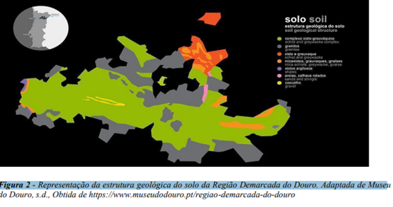 - Solo Na RDD, a litologia caracteriza-se pela variação de rochas metassedimentares (Bateira, 2006). Este território integra-se sobre uma formação geológica de idade Pré-Câmbrica chamada de Complexo Xisto-Grauváquico, além de algumas inclusões geológicas de natureza granítica (IVDP, 2021). Devido a este complexo, os solos são na sua maioria derivados de xisto, conforme representa a Figura 2 (Figueiredo, 2015; IVDP, 2021). Originalmente, os solos desta região integram-se num grupo formado por unidades denominadas por Leptossolos (presentes em maior proporção), Cambissolos e Fluvissolos (em menor proporção). Tais grupos representam determinados tipos de solos, tendo sido possível conservar o perfil original devido às intervenções humanas menos bruscas (Figueiredo, 2015; IVDP, 2021). No entanto, as intervenções mecânicas necessárias para a instalação da vinha modificam o perfil original do solo (Figueiredo, 2015), alterando a classificação dos mesmos para Antrossolos Áricos Terrácicos (maioritariamente composto por xistos) e Antrossolos Áricos Surríbicos (composto por formações sedimentares), segundo a classificação proposta na Carta de Solos, de Aptidão da Terra e de Utilização Actual dos Solos (Agroconsultores e Coba, 1991; Figueiredo, 2015).
