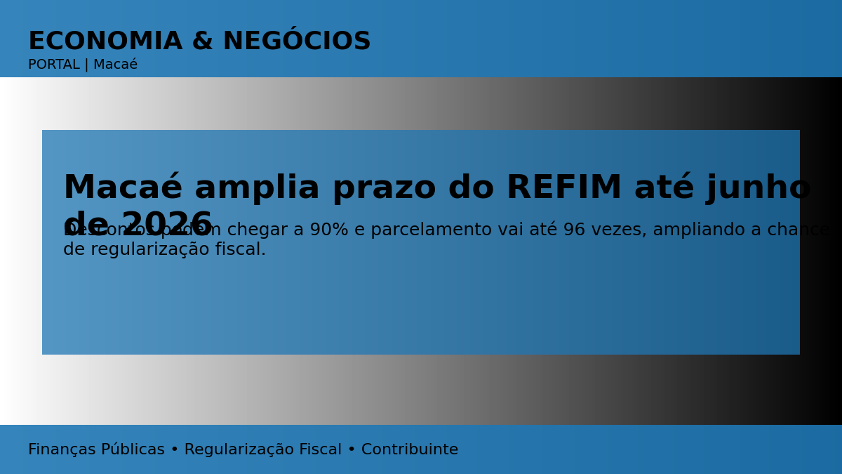 A Prefeitura de Macaé prorrogou o prazo de adesão ao Programa de Refinanciamento Municipal (REFIM) até 26 de junho de 2026, mantendo condições consideradas agressivas para regularização de débitos: descontos de até 90% sobre juros, multas e correção e parcelamento em até 96 parcelas, conforme modalidades previstas na legislação vigente.