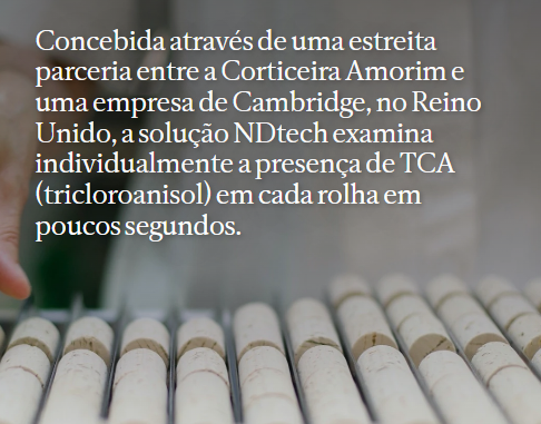 Paralelamente, a Amorim Cork foi precursora na utilização da cromatografia gasosa (GC- Gas Chromatography), um minucioso sistema de controlo de qualidade através do qual máquinas de elevado rigor examinam as rolhas no plano molecular. Graças a avanços científicos, à inovação tecnológica e à digitalização industrial, foi possível levar ainda mais longe esta rigorosa ferramenta de controlo de qualidade. Na sequência de um investimento de 12 milhões de euros em I&D+i ao longo de seis anos, a Corticeira Amorim desenvolveu a tecnologia NDtech, a mais avançada técnica de controlo de qualidade da indústria.”