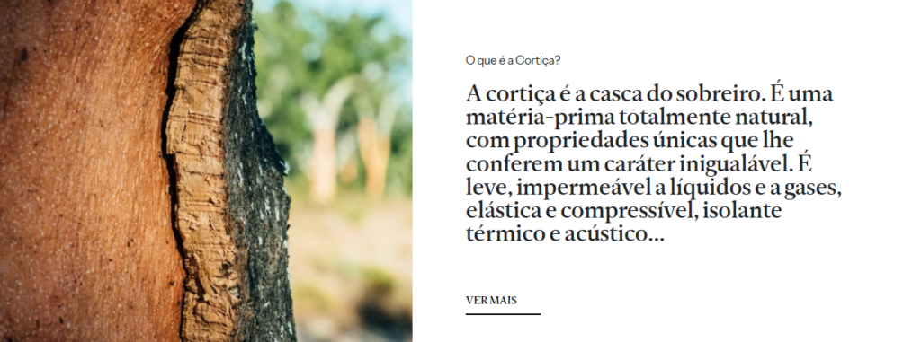 “Retirada a cada nove anos, sem que nenhuma árvore seja cortada durante este processo de descortiçamento, a cortiça origina uma infinidade de produtos, desde os tradicionais aos mais inovadores, inesperados e arrojados. O principal desses produtos é a rolha. Todavia, nem toda a cortiça possui os requisitos necessários para poder transformar-se nesse nobre objeto.”